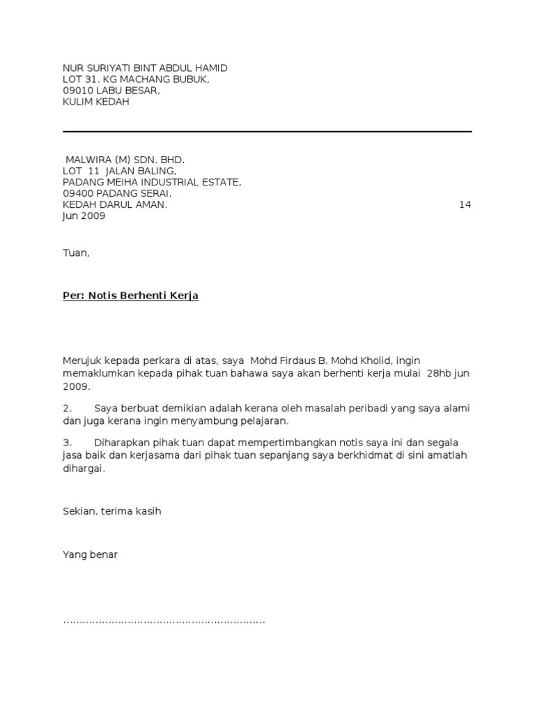 Ahmad farhan bin ahmad fuad no4, kg tebuk, sungai kob, 09700 karangan, kedah darul aman. 7 notis ideas resignation lettering easy decision. Surat rasmi berhenti kerja dalam bahasa english. Contoh surat berhenti kerja (resignation letter). Perkongsian contoh surat rasmi notis berhenti kerja (resignation letter) adalah.